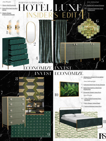 Mix high & low: Splurge for quality and unique visual appeal on centerpieces (eye-catching & design-defining) or focal points (at end of main lines of site) items. Economize on the rest.