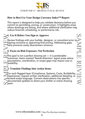 Independent architectural assessment of your drawings, proposals, and documentation before you commit.